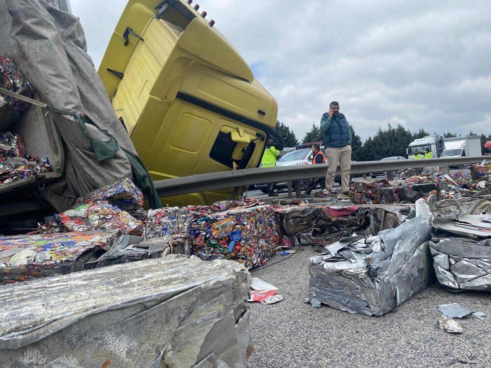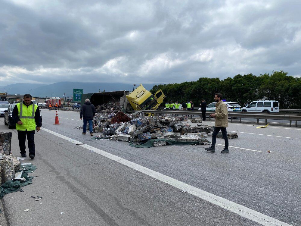 Kazada tırda yüklü hurdalar yola saçılarak, trafiği olumsuz etkiledi.